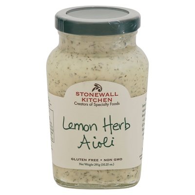 PRODUCT DETAILS: Gluten free. Non GMO. Creators of specialty foods. Creamy and versatile, our Lemon Herb Aioli makes a wonderful sauce for all types of fish. The bright lemon flavor of the aioli is enhanced with just the right touch of garlic, dill and tarragon. Serve this fresh-flavored aioli with crab cakes or salmon or warm it and spoon over sauteed asparagus. stonewallkitchen.com.
