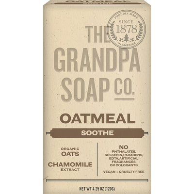 PRODUCT DETAILS: Certified vegan. vegan.org. Vegan + cruelty free. Organic oats. Chamomile extracts. No phthalates, sulfates, parabens, EDTA, artificial fragrances or colorants. Hardworking, simple, pure ingredients are the heart of our soapmaking tradition. A Comforting Combination: Soothing and smoothing organic oats and colloidal oatmeal along with calming chamomile flower extract gently exfoliate and soften skin to replenish its healthy glow. Family owned and operated. Family owned and operated. grandpasoap.com. 859-647-0777. Women owned. Carton made with 30% total recycled fiber. Sustainable Forestry Initiative: Certified sourcing. www.sfiprogram.org. Cruelty free. Proudly made in America since 1878.
