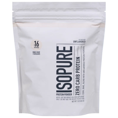 PRODUCT DETAILS: No flavor added. Cook, bake, blend with unflavored protein powder. 25 g protein. 5 g naturally occurring BCAAS per serving. Gluten & lactose free. Zero sugar (Not a low calorie food). Zero carb. Zero fat. Keto-friendly. GMO free. (Total BCAAs 5.5 grams typical amounts per serving) Naturally occurring amino acid pofile: Essential amino acids (EAAs): Isoleucine (12 G); Leucine (12 G); Lysine (12 G); Methiporine (12 G); Phenylalanine (12 G); Threonine (12 G); Tryptophan (12 G); Valine (12 G); Histidine (12 G). Conditionally Essential Amino Acids (CEAAs): Anginine (8 G); Cysteine (8 G); Glutamine & Glutamic Acid (8 G); Glycine (8 G); Proline (8 G); Tyrosine (8 G). Nonessential Amino Acids (NON-EAAs): Alamine (5 G); Aspartic Acid (5 G); Serine (5 G). Cook, bake, blend with unflavored protein powder. From 100% whey protein isolate. No added colors / sweeteners. rBST free (No significant difference has been found between milk derived from rBST-treated and non-rBST treated cows) whey. Pure, unflavored protein powder-add to any recipe! The easy way to add high-quality protein into your preferred flavored beverages (hot or cold), smoothies, soups, sauces and baked goods recipes. Isopure Zero Carb Protein powder contains 25 grams of GMO free and rBST free (No significant difference has been found between milk derived from rBST-treated and non-rBST treated cows) 100% Whey Protein Isolate. 100% whey protein isolate means exceptional purity and quality: excess fat, cholesterol, sugars, carbs, lactose and other fillers are removed to give you everything you desire and nothing you don't. And still it comes with 4.5 grams of naturally occurring glutamine, 5 grams of naturally occurring BCAAS but no added colors, flavors or sweeteners. Check out the many delicious recipes you can serve up using Unflavored-tons of recipes created by us, and our active community. From super-charged smoothies to protein-packed pancakes or cookies, there are infinite options to amplify your meals. Contents sold by weight, not volume. Contents will settle. Quality Commitment: Isopure products are manufactured in accordance with Good Manufacturing Practices (GMP) established by the U.S. Food and Drug Administration (FDA). To assure the highest quality and food safety standards, and adhere to label claims, isopure products are tested by our Quality Assurance team laboratories. theisopurecompany.com. Isopure: Authentic Product: To ensure authenticity of this product make sure the Isopure hologram is present on the authentic badge for more information. Please scan the or code or visit us at www.theisopurecompany.com/authentic. Call us at 1-877-309-3329. Visit us at theisopurecompany.com. Manufactured in the USA. This product contains ingredients of international and domestic origin.
